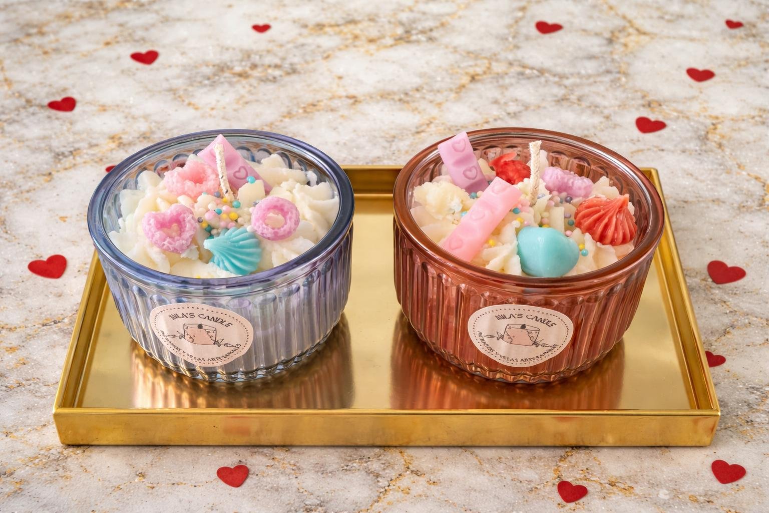 Su diseño simula deliciosos postres, con una decoración tipo crema batida en la parte superior, acompañada de pequeños corazones, figuras dulces y detalles en colores pastel que les dan un toque romántico, delicado y encantador. Cada elemento está cuidadosamente elaborado para ofrecer una pieza decorativa que enamora a primera vista.