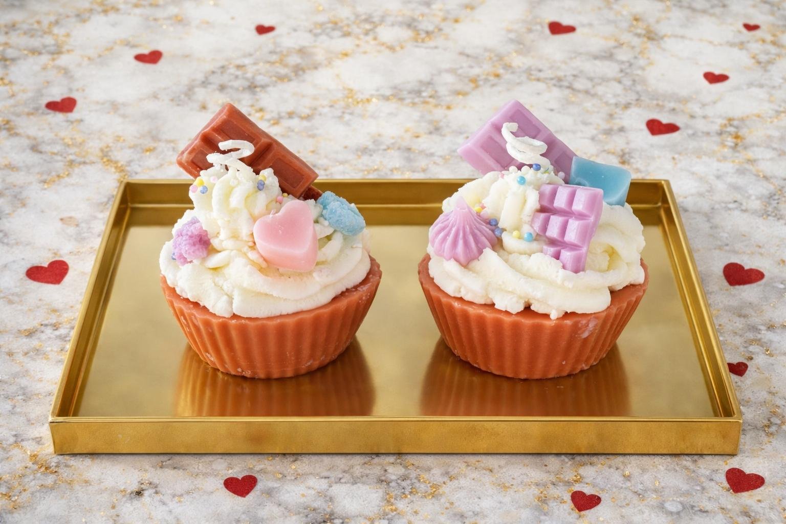 Cada vela está decorada con pequeños corazones, mini tabletas tipo chocolate y figuras en tonos pastel, creando un diseño romántico y encantador que conquista a primera vista. Presentadas sobre una bandeja dorada y con un fondo lleno de pequeños corazones, transmiten amor, delicadeza y estilo.